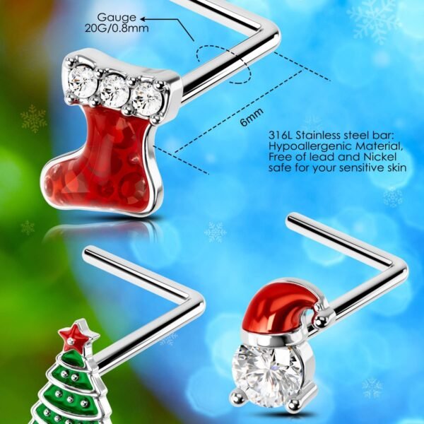 3Pcs Nose Studs, Shining Christmas 20G Nose Rings L Shaped Cute Deer Star Tree Silver Stainless Steel Nose Rings Studs Nose Piercing Jewelry for Women Men-7MM-6
